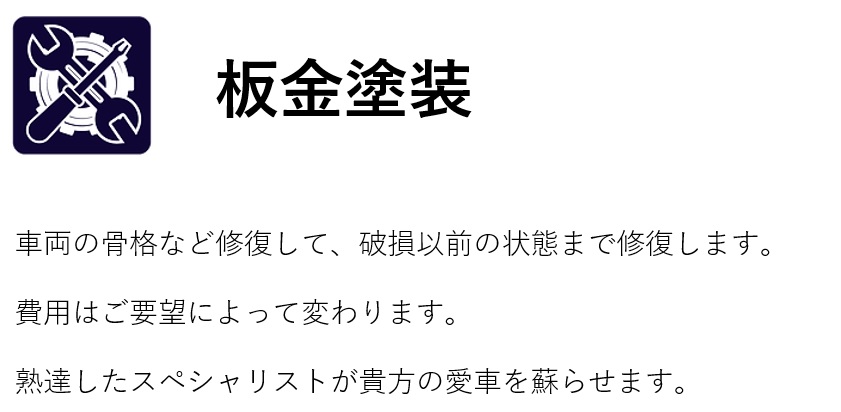 自動車板金を主サービスとし、国産旧車のレストアや国産旧車の中古車販売をしています